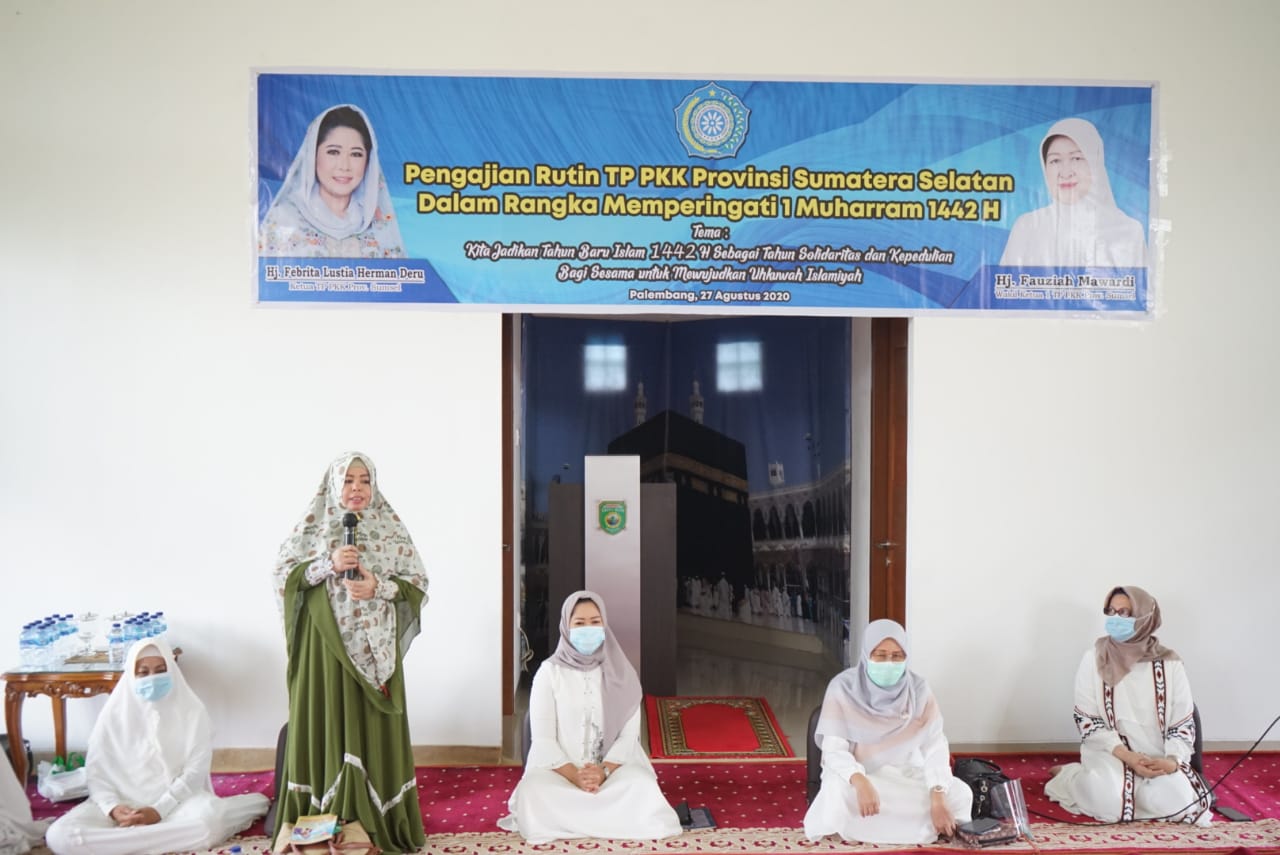 Ketua TP PKK Sumsel Hj. Feby Deru mengucapkan Alhamdulilah meskipun di tengah Pandemi Covid19 pengajian rutin bulanan sekaligus peringatan tahun baru Islam 1442 Hijriah masih dapat digelar sebagai wadah menambah ilmu keagamaan serta dijadikan ajang untuk bersilaturahmi antar majelis taklim dan sesama umat muslim lainnya.