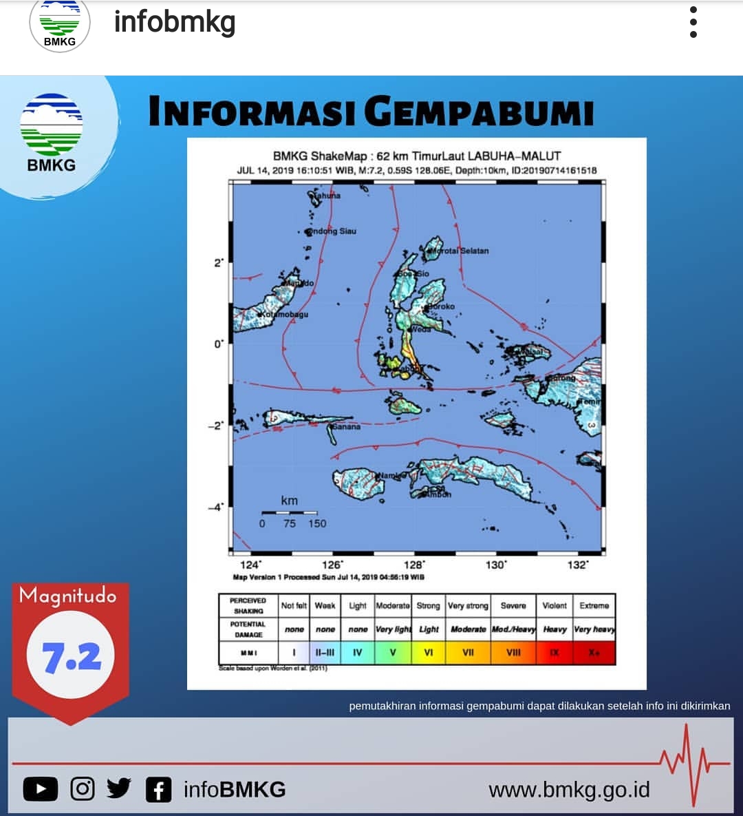 Gempa berkekuatan 7,2 skala richter dilaporkan mengguncang Maluku Utara, Minggu (14/7). Badan Metereologi, Klimatologi, dan Geofisika (BMKG) mengumumkan gempa tersebut terjadi sekitar pukul 16.10 WIB. Pusat gempa disebut berada sekitar 62 kilometer timur laut Labuha, Maluku Utara, dengan koordinat 0,59 LS dan 128,18 BT.