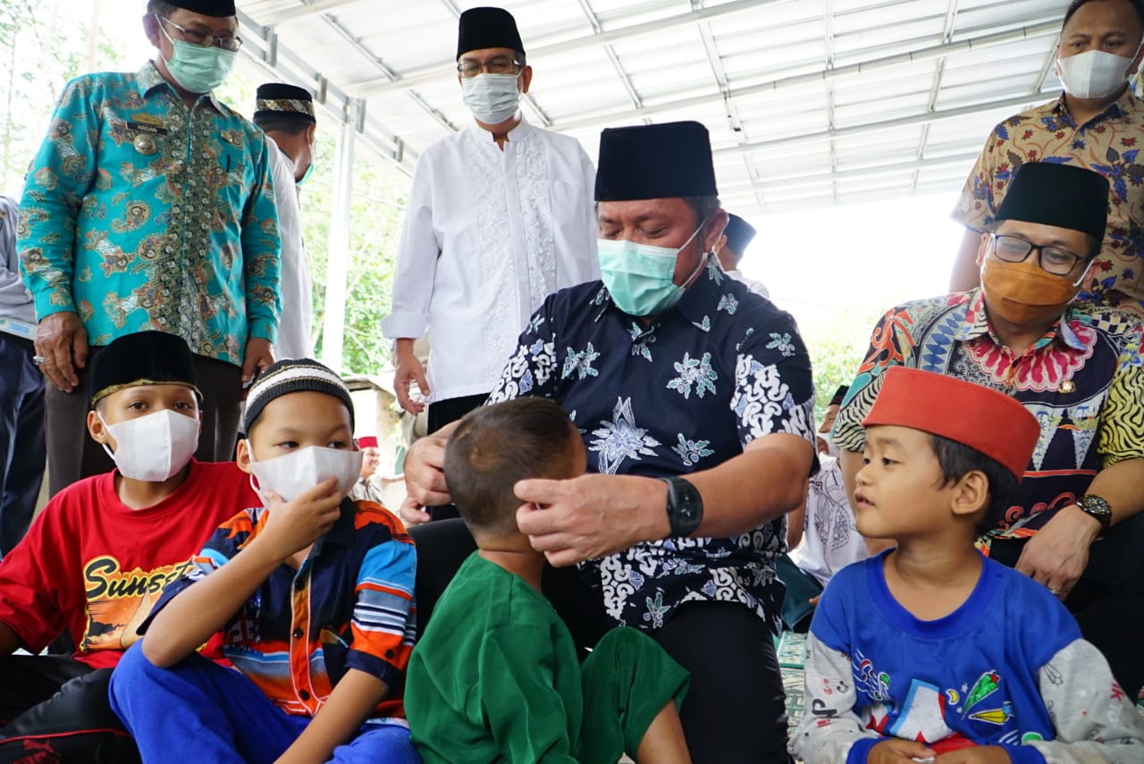 Dalam safari Jumatnya kali ini Herman Deru juga membagikan masker kepada para jemaah. Bahkan Gubernur tampak memasangkan masker pada kalangan jemaah anak-anak.