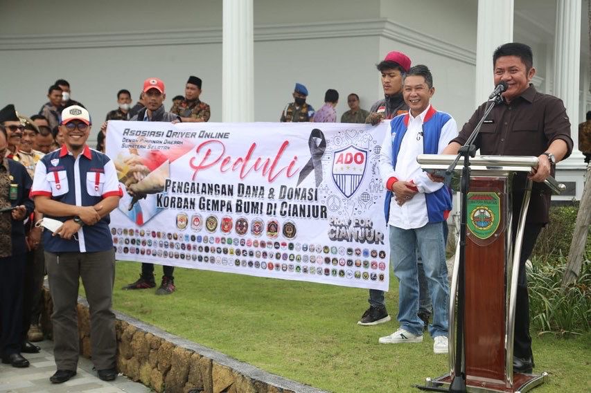 PALEMBANG – Kepedulian yang ditunjukan kalangan pengemudi ojek online di Kota Palembang yang tergabung dalam Asosiasi Driver Online (ADO) dibawah Ketua Umum ADO Sumsel, M Asrul Indrawan terhadap para korban gemba di Kabupaten Cianjut Jabar mendapatkan apresiasi khusus dari Gubernur Sumsel Herman Deru.