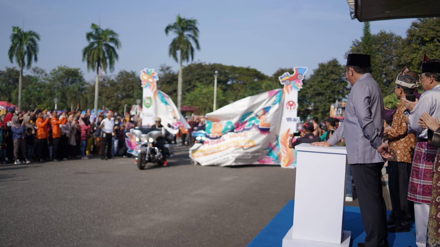 Iring-iringan karnaval tersebut dilepas langsung oleh Gubernur Sumsel H. Herman Deru didampingi Ketua TP PKK Provinsi Sumsel Hj. Feby Deru.