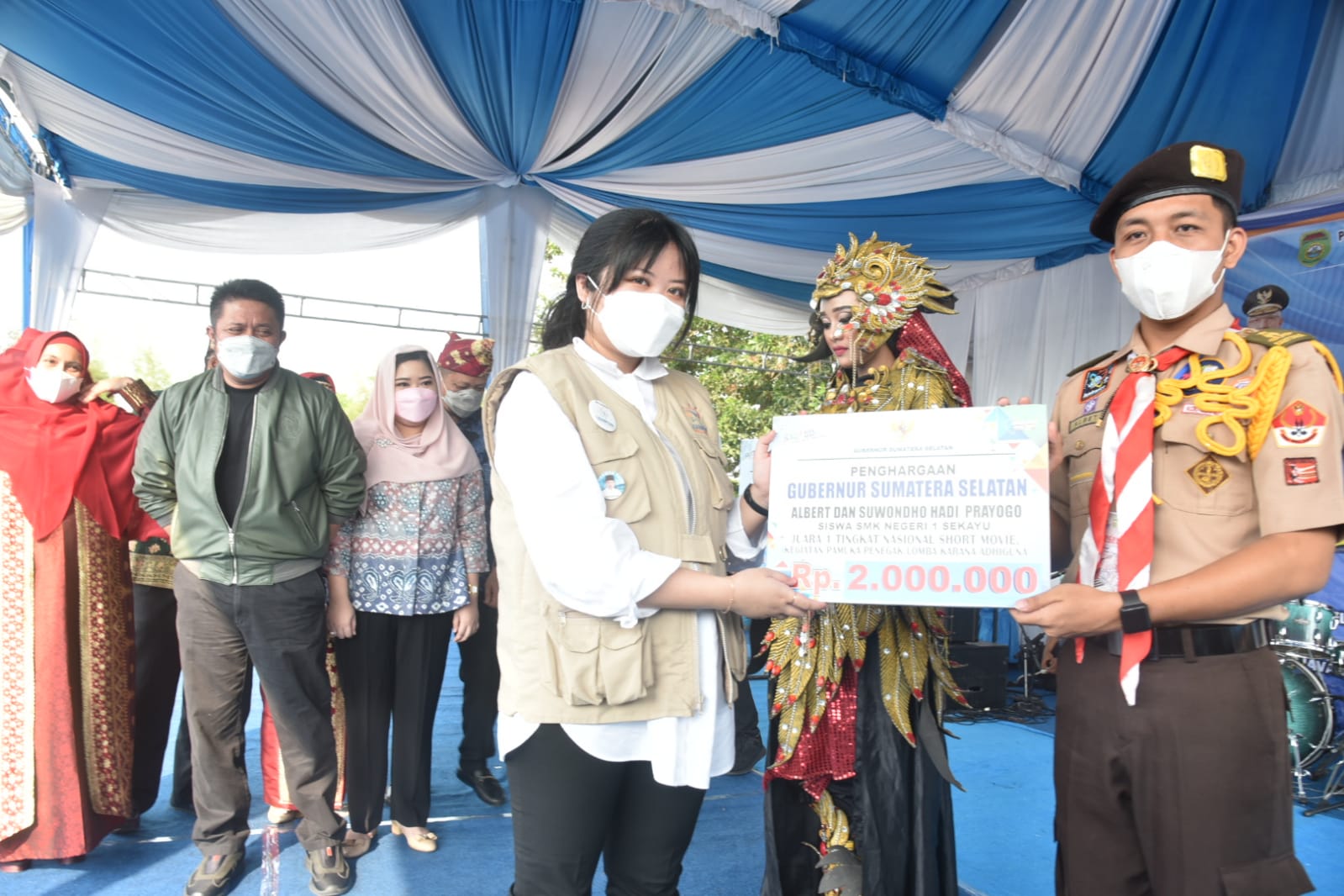 Selain melepas karnaval, dalam kesempatan tersebut, Gubernur Sumsel Herman Deru didampingi dua putrinya yang juga Ketua Pengurus Korwil Indonesia Council for Small Business (ICSB) Sumsel Samantha Tivany HD dan Duta Anti Narkoba Provinsi Sumsel Ratu Tenny Leriva HD menyerahkan penghargaan kepada perwakilan siswa SMK berprestasi.