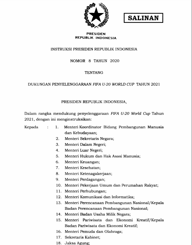 ‘’Mengambil langkah-langkah sesuai tugas, fungsi, dan kewenangan masing-masing secara terkoordinasi dan terintegrasi untuk mendukung penyelenggaraan FIFA U-20 World Cup Tahun 2021,’’ bunyi Diktum PERTAMA Inpres tersebut.