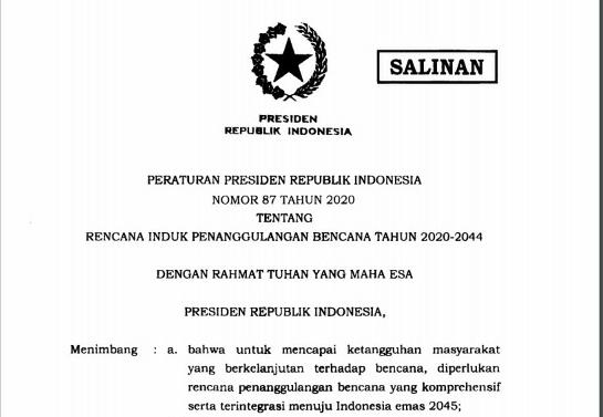 Untuk itu, Presiden Joko Widodo (Jokowi) telah menetapkan tentang Peraturan Presiden (Perpres) Nomor 87 Tahun 2020 tentang Rencana Induk Penanggulangan Bencana RPIB Tahun 2020-2044 yang ditandatangani pada 10 September 2020.