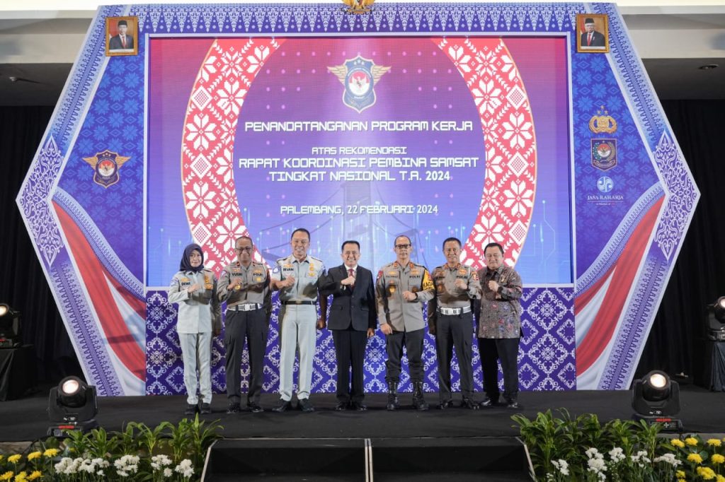Kepala Korps Lalu Lintas (Kakorlantas) Polri Irjen Pol Aan Suhanan bersama PJ Gubernur Sumsel Agus Fatoni dan Direktur Utama PT Jasa Raharja Rivan Achmad Purwantono menghadiri Rapat Koordinasi Tim Pembina Samsat Nasional, di hotel Arista, Palembang, Sumatera Selatan, Kamis (22/2/2024). Dilanjutkan Penandatanganan Program Kerja.