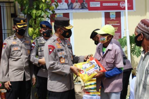 Kapolda Sumsel Irjen Pol Eko Indra Heri melakukan kegiatan bantuan sosial dengan membagikan langsung bantuan sembako di Kelurahan Talang Bubuk Plaju Palembang Senin (09/08/21).
