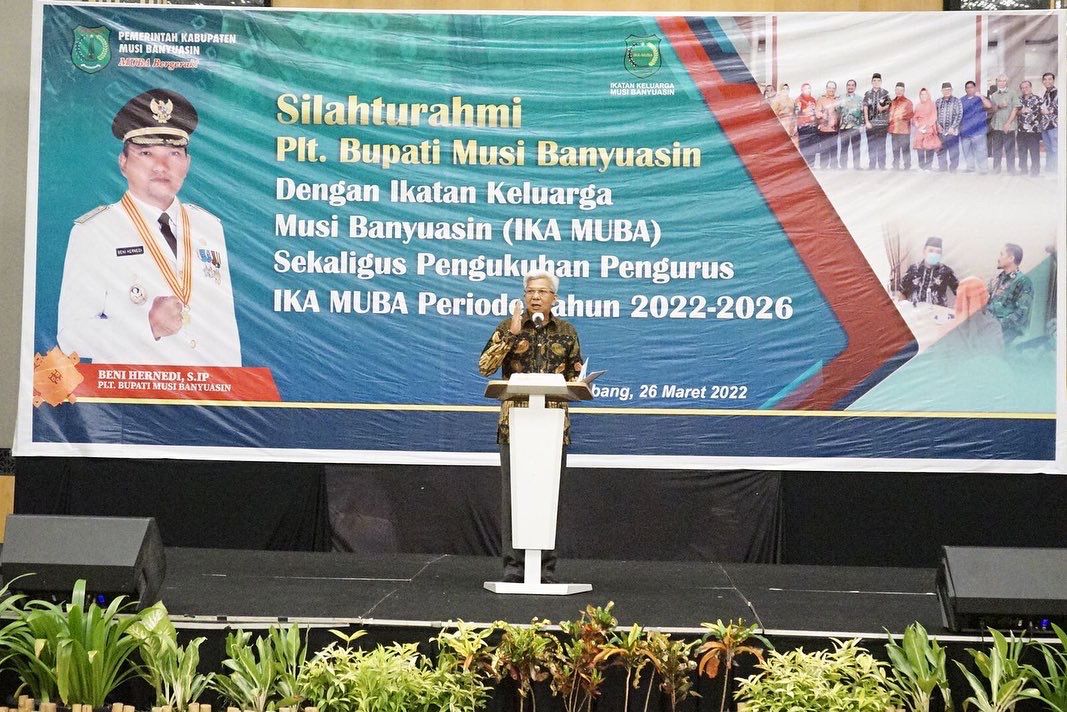 Plt Bupati Musi Banyuasin Beni Hernedi mengapresiasi kompaknya organisasi IKA MUBA. Ia mencatat apa yang disampaikan Ketua IKA Muba dimana terdapat 512.000 warga Muba atau masyarakat berdarah asli Muba yang ada di kota Palembang berdasarkan sensus.