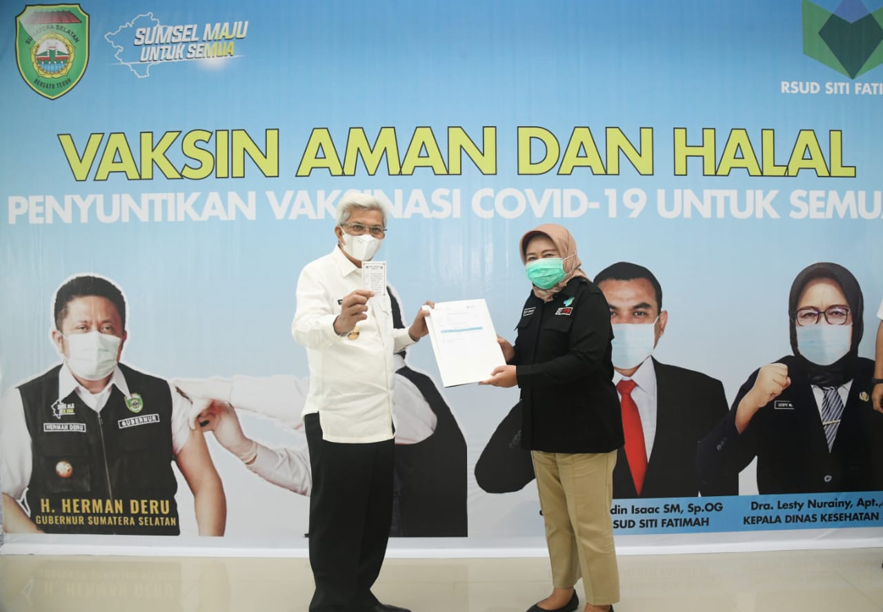 Wakil Gubernur Sumatera Selatan Mawardi Yahya menjalani vaksinasi Covid-19 dosis pertama yang dilaksanakan di RSUD Siti Fatimah, Rabu (24/3) pagi.  Usai mendapatkan suntikan vaksin Mawardi terlihat tenang dan percaya diri  bahkan  tersenyum  lebar dihadapan awak media.