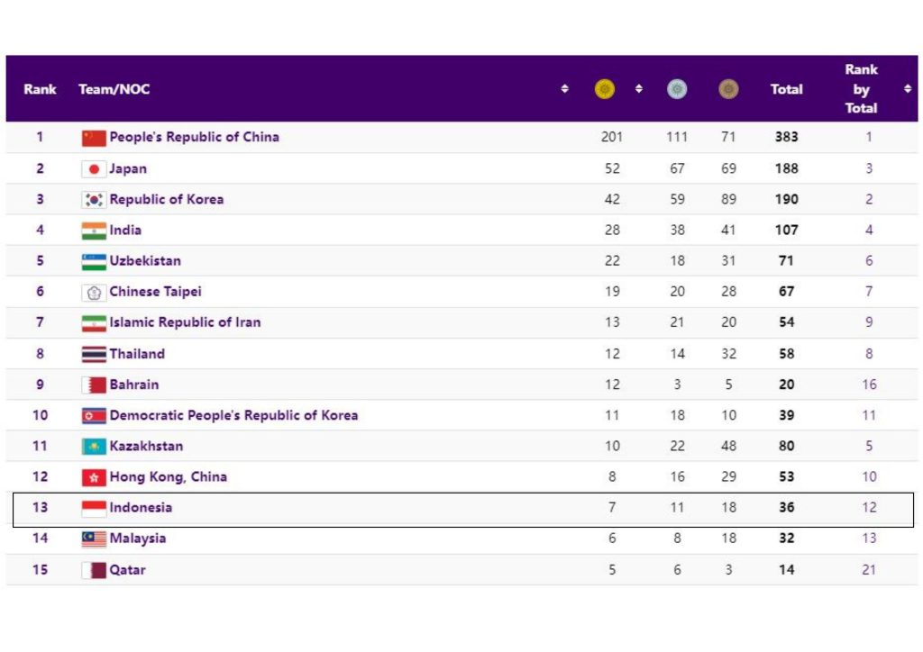 Kontingen Indonesia pulang membawa 7 medali emas, 11 perak, dan 18 perunggu dan berada pada urutan ke-13 Asian Games 2022 Hangzhou. Hasil ini sedikit berada di bawah target Kementerian Pemuda dan Olahraga (Kemenpora) yaitu peringkat ke-12 dengan 8 medali emas.
