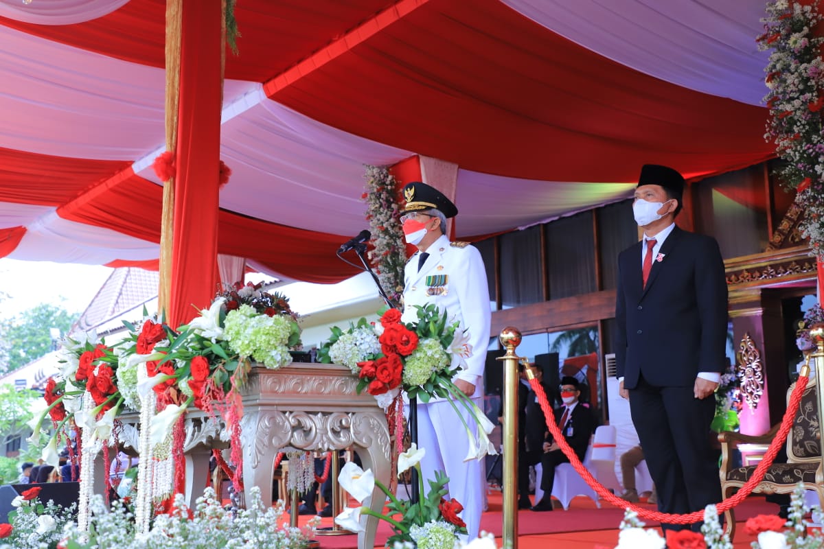 PALEMBANG – Meskipun diguyur hujan gerimis upacara Penurunan Bendera Merah Putih HUT Kemerdekaan RI  ke 76 Tahun 2021 di halaman Istana Gubernur Griya Agung Palembang, Selasa (17/8) sore tetap berjalan dengan sukses dengan Inspektur upacara (Irup) Wakil Gubernur Ir Mawardi Yahya.