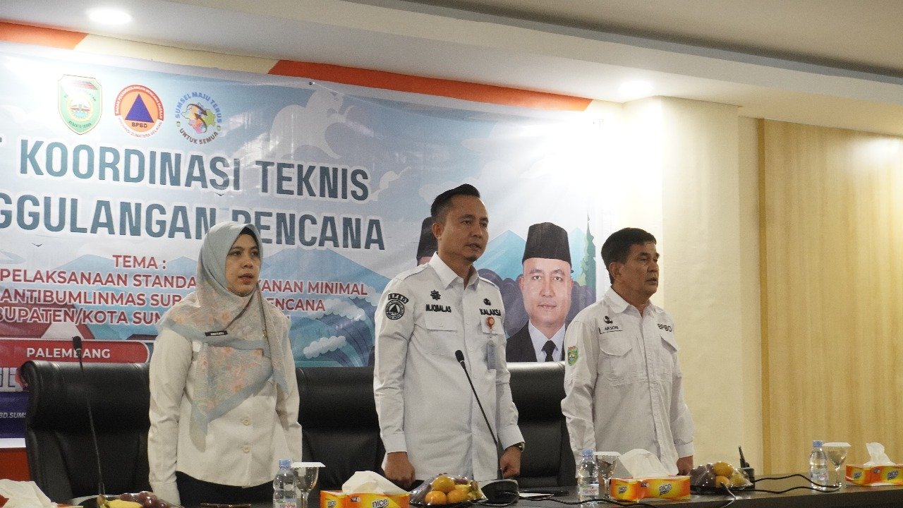 Badan Penanggulangan Bencana Daerah (BPBD) Sumatera Selatan menggelar Rapat Koordinasi Teknis (Rakertek) Penanggulangan Bencana dengan tema “Sinkronisasi Pelaksanaan Standar Pelayanan Minimal (SPM) Trantibumlinmas Sub-Urusan Bencana Kabupaten/Kota se-Sumatera Selatan”, di Kantor BPBD Sumsel, Rabu (15/10/2025).