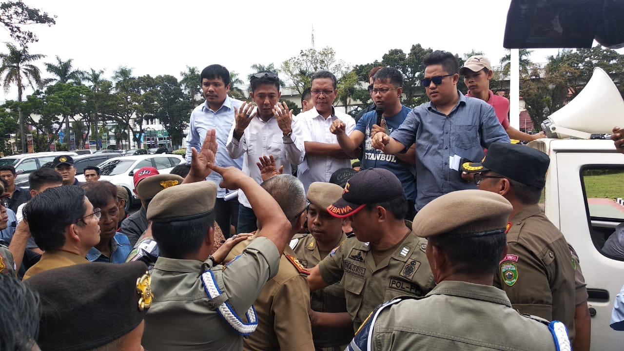 Aliansi untuk Indonesia Cerdas saat melakukan aksi damai di kantor Gubernur Sumsel, Senin (13/4). Dalam aksi ini, mereka memberikan Lima tuntutan kepada Gubernur Sumsel berjanji bahwa sekolah gratis di Sumsel tetapi saat ini masih banyak para wali murid yang diminta untuk membayar dan pungutan.