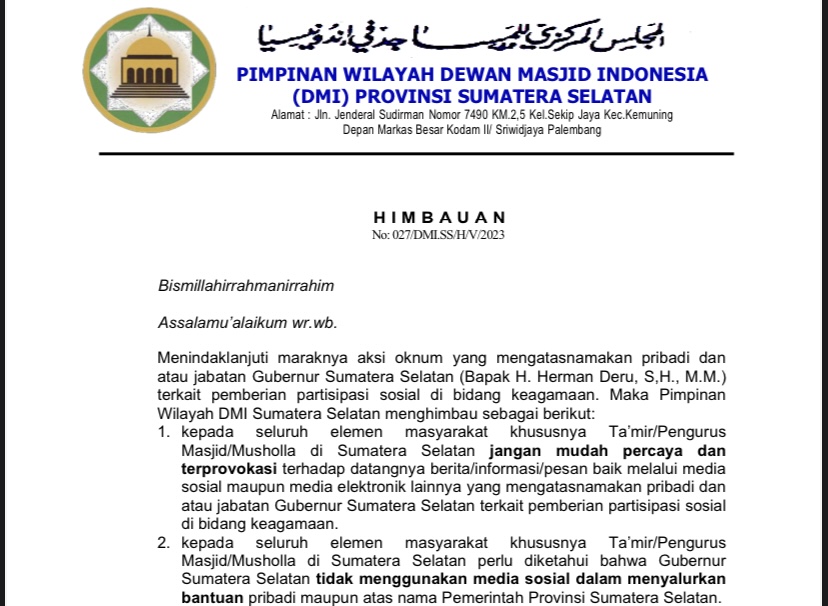 Salam surat himbauannya, Ketua DMI Sumsel menjelaskan bahwa menindaklanjuti maraknya aksi oknum yang mengatasnamakan pribadi dan atau jabatan Gubernur Sumatera Selatan (Bapak H. Herman Deru, S.H., M.M.) terkait pemberian partisipasi sosial di bidang keagamaan. Maka Pimpinan Wilayah DMI Sumatera Selatan menghimbau sebagai berikut: