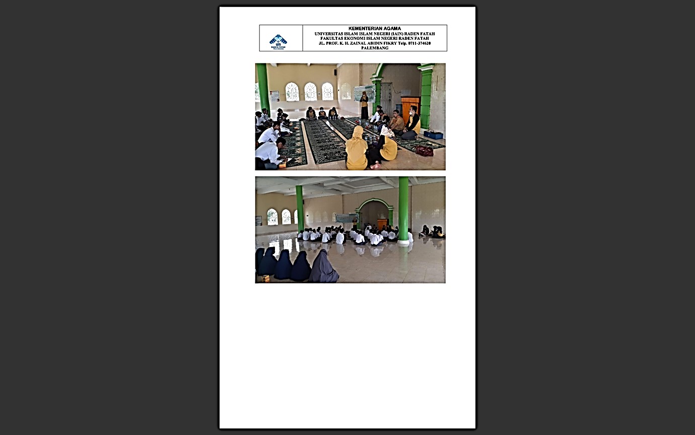 25 Mei 2021 Dosen dan Mahasiswa Fakultas Ekonomi dan Bisnis Islam melaksankan Kegiatan Pengabdian Kepada Masyarakat yang bertempatan di Masjid Al-Madinah Pondok Pesantren Thawalib Sriwijaya Palembang.