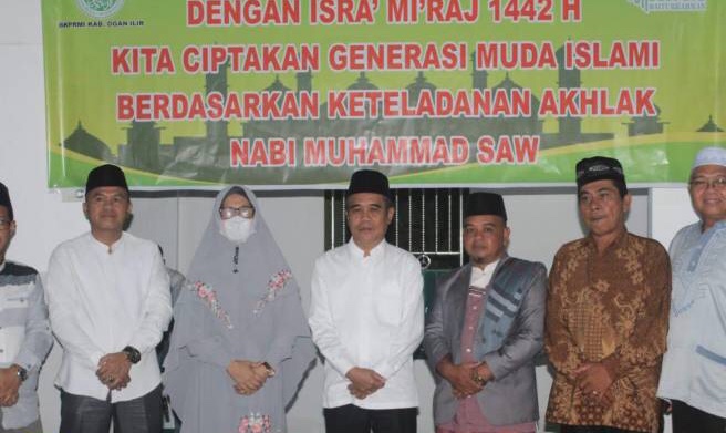 Wakil Bupati Ogan Ilir Ardani didampingi Wakil Ketua TP PKK Kabupaten Ogan Ilir Faizah, Kabag Kesra, Camat Indralaya Utara, dan Kepala Desa Pulau Semambu menghadiri peringatan Isra’ Mi’raj Nabi Muhammad SAW di Masjid Baiturrahman di Desa Pulau Semambu, Kecamatan Indralaya Utara, Sabtu (20/3/2021).