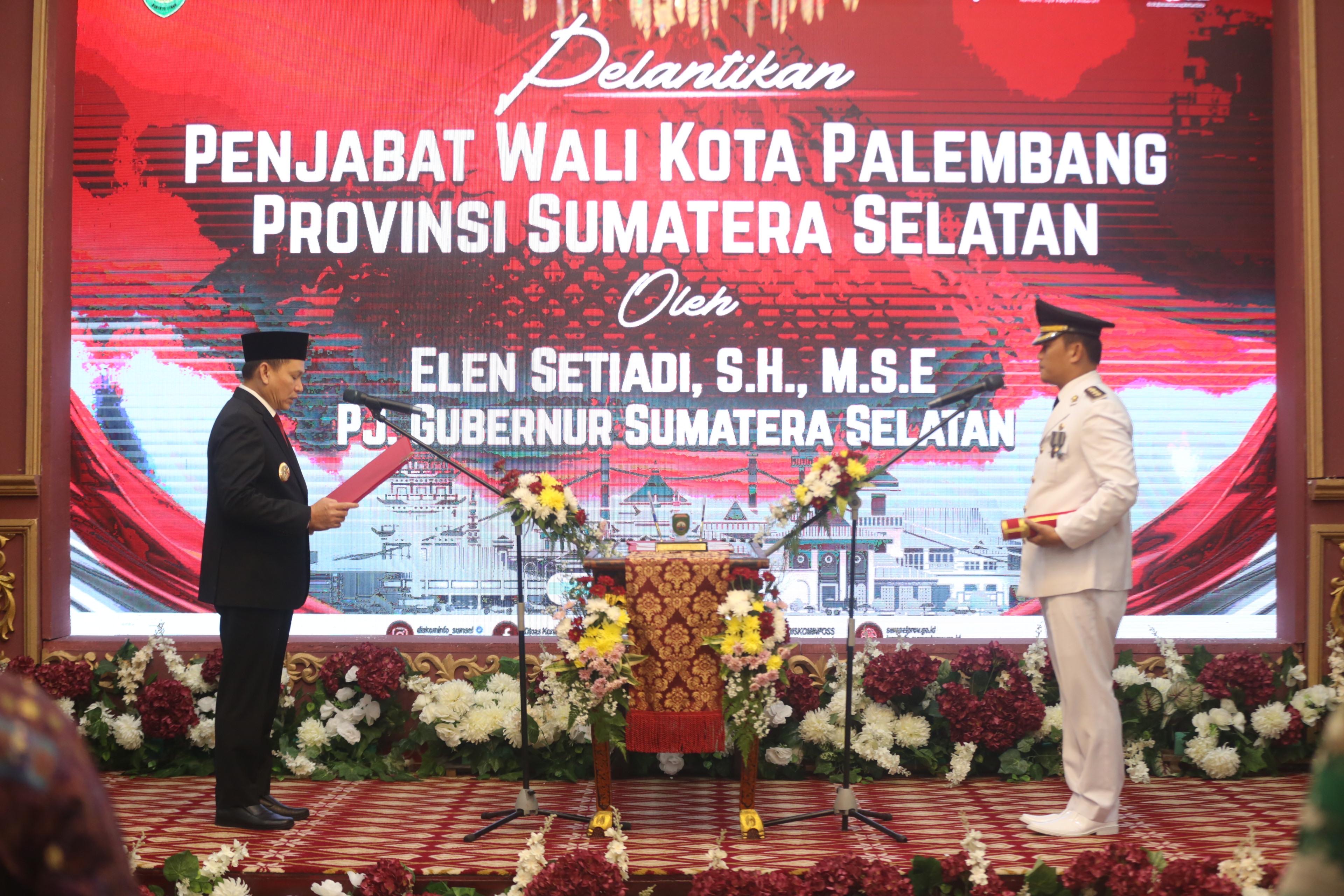 Palembang. Penjabat (Pj) Gubernur Sumatera Selatan (Sumsel) Elen Setiadi, S.H., M.S.E melantik Dr. Cheka Virgowansyah, S. STP M.E sebagai Pj Walikota Palembang menggantikan Dr. A. Damenta, Pelantikan ini bertempat Griya Agung Palembang, Jumat (29/11/2024).