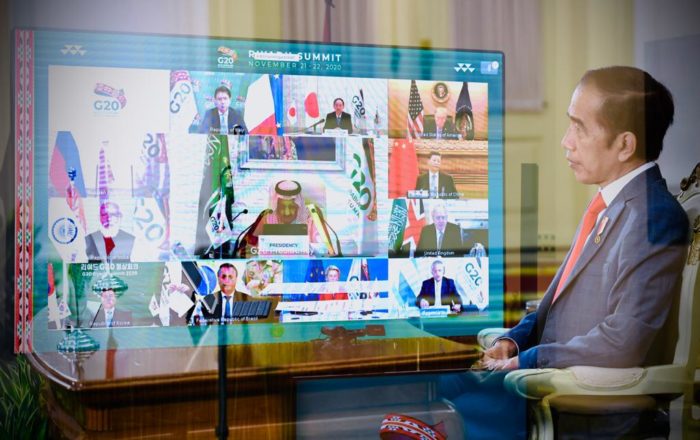 Presiden Joko Widodo, Sabtu (21/11) malam, menghadiri Konferensi Tingkat Tinggi (KTT) G20 secara virtual dari Istana Kepresidenan Bogor, Jawa Barat. Di hari pertama KTT G20 ini Presiden didampingi oleh Menteri Luar Negeri Retno LP Marsudi, Menteri Keuangan Sri Mulyani, dan Sekretaris Kabinet Pramono Anung.