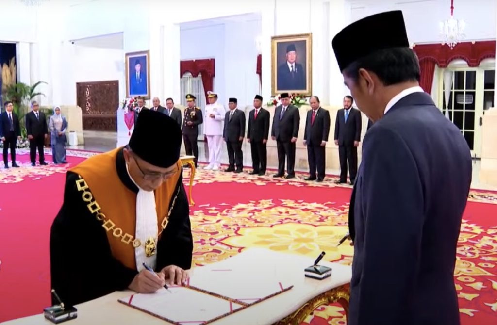 Presiden RI Joko Widodo (Jokowi)  menyaksikan pengucapan sumpah Sunarto sebagai Wakil Ketua Mahkamah Agung (MA) Bidang Yudisial. Acara pengucapan sumpah tersebut digelar di Istana Negara, Jakarta, Senin (03/04/2023).
