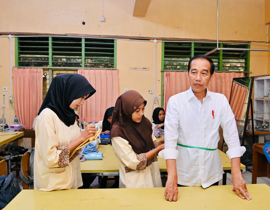 Sementara ketika bertemu dengan siswa tata busana, Presiden memuji keahlian para siswa yang sudah bisa membuat gaun pesta. “Coba saya, buatkan pakaian ya. Ayo ukur,” ucap Presiden.