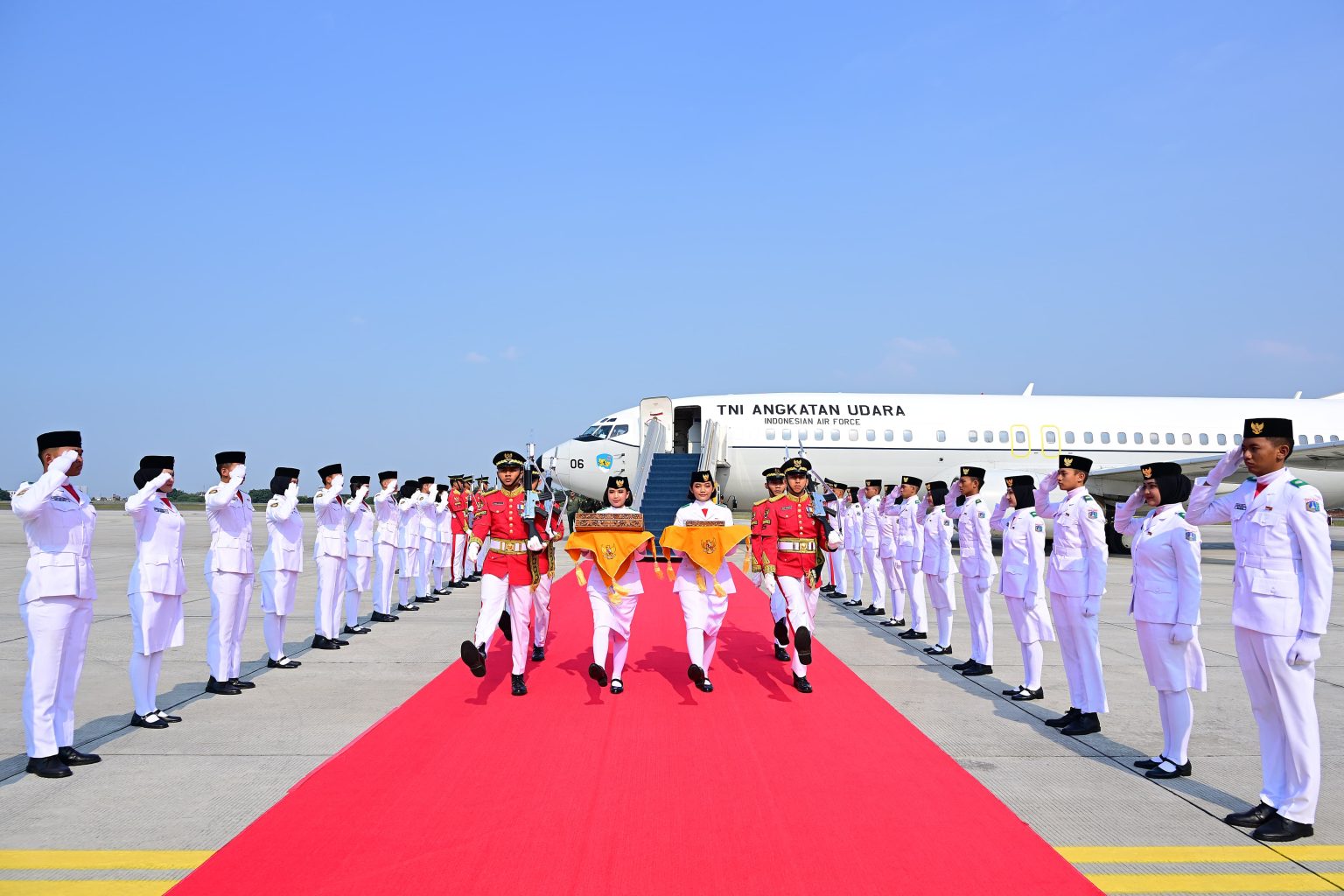 Keduanya menuruni tangga pesawat dengan disambut jajar kehormatan Paspampres dan Purna Paskibraka dari Provinsi DKI Jakarta. Kedua Purna Paskibraka pembawa Sang Merah Putih dan teks proklamasi tersebut kemudian menaiki kendaraan taktis “Maung”.