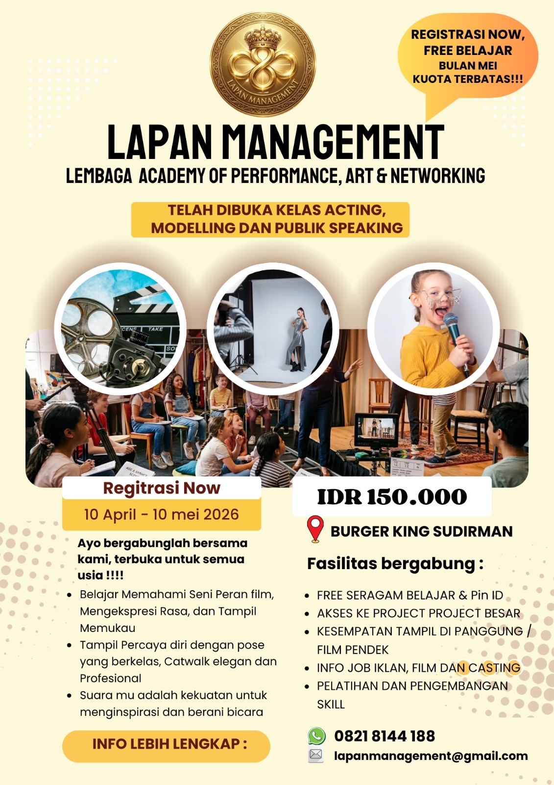 Pendaftaran dibuka mulai 10 April hingga 10 Mei 2026 dengan kuota terbatas. Program ini menjadi peluang bagi masyarakat yang ingin mengasah bakat sekaligus menembus dunia hiburan secara profesional.