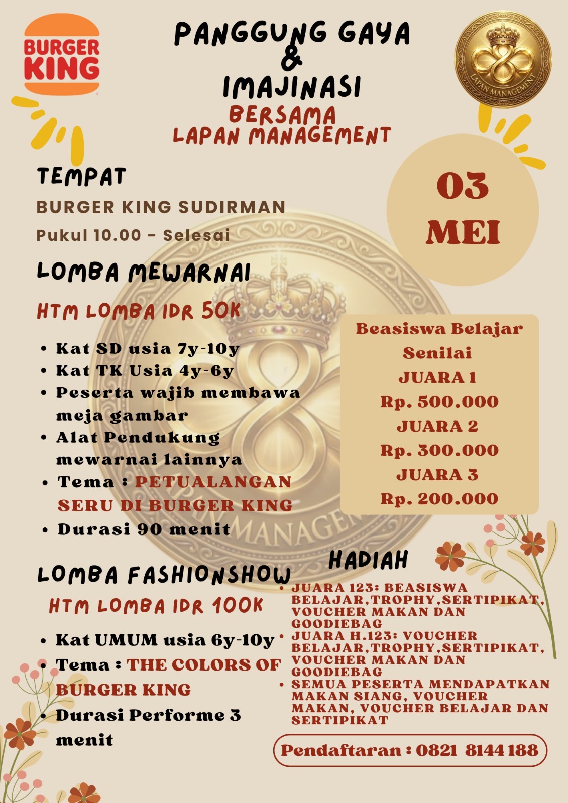 Bagi masyarakat yang berminat, informasi lebih lanjut dapat diperoleh dengan mendatangi langsung Burger King Sudirman Palembang atau menghubungi nomor 0821-8144-188.